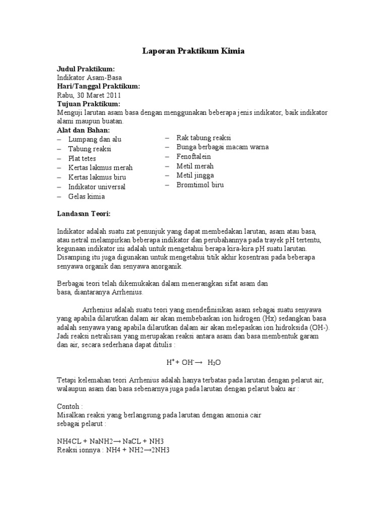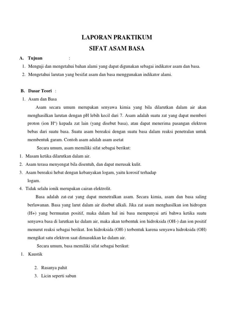 Bahan yang digunakan dalam praktikum kimia dasar dengan materi titrasi asam basa yaitu naoh 0,1 n 50 ml, phenolphtalein 3 tetes, hcl 6 ml. Asam dan basa merupakan dua golongan zat kimia yang sangat penting. Menurut arrhenius, asam adalah zat yang dalam air akan melepaskan ion h+. Asam adalah suatu zat yang dapat memberi proton(ion h +) kepada zat lain (yang disebutbasa), atau dapat menerima pasangan electron bebas dari suatu basa.suatu asam bereaksi dengan suatu basa dalam reaksi penetralan untuk. Fungsi asam dan basa, bertukar dalam persamaan yang telah. Alifa hana xi ipa 2 tujuan praktikum mengetahui keefektifan bunga mawar sebagai indikator alami asam basa. Laporan praktikum ini berjudul ‘ indikator asam basa alami’. Asam dan basa sangat berpengaruh terhadap kondisi lingkungan. Laporan praktikum kimia ph asam basa. Alkali (basa) berasal dari kata arab, yang mengacu ke abu tumbuhan tertentu yang zat alkalinya dapat diekstraksi.