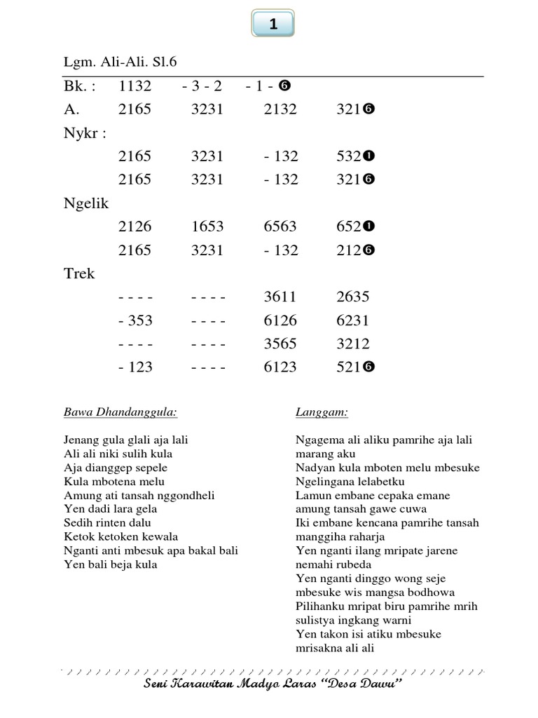 Ada 2 pengertian yang terkandung di dalam gending, yang pertama adalah pengertian gending secara luas adalah komposisi atau semua komposisi lagu di dalam gamelan.untuk orang yang sudah mengenal. Gendhing amilas kethuk 2 awis minggah 4, laras sléndro pathet sanga (harjito) 3. Bahasa dan budaya > gending dan notasi. Notasi ladrang wahyu slendro, mohon maaf jika banyak kekurangan karena mungkin beda garapan atau notasi. Kirimkan ini lewat emailblogthis!berbagi ke twitterberbagi ke facebookbagikan ke pinterest. • • • • • 3 2 3 • 6 • 5 •. » gêndhing ladrang dhandhanggula, salendro, kagerong. If not already installed, click. » kabor katawang salendro 6.