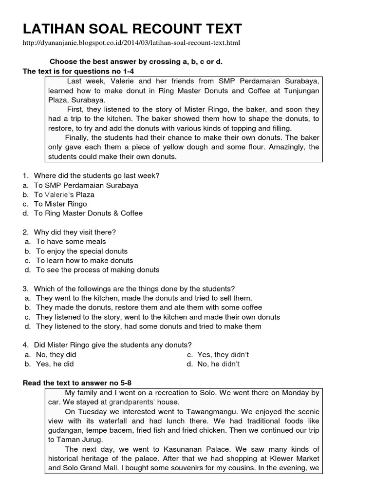 Latihan Soal Recount Text. One christmas in 2007, i was joining a final test try out at school. I saw a lot of animals there at the zoo. Soal recount text kelas 10.contoh soal un bahasa inggris mencari ide pokok paragraf. Berikut adalah contoh soal ulangan recount text pilihan ganda. I went to the zoo, a place with lots of animals. I went there with my friends and my teacher, mr. By ayunara bahar on 1/30/2018 10:04:00 am in bahasa inggris , ujian nasional bahasa inggris sma. Secara sederhana text ini juga sering disebut sebagai teks menceritakan pengalaman dimasa lampau. It was held from 8 a.m. It would strike twelve in twenty minutes’ time. Happy new yearon saturday night, we went to the town hall. He arrived at the railway station at 3 p.m. One of my schoolmates, rini, asked me to accompany her to the bus stop. Contoh kalimat dan soal latihan soal cause and effect dan jawabannya soal must, have to dan should pilihan ganda (modals of obligation) penjelasan paling mudah procedure text dan manual beserta contohnya menu halaman statis. Ada pula soal yang lumayan, tidak mudah juga tidak sulit (mods), serta ada juga soal katagory sulit (hots).