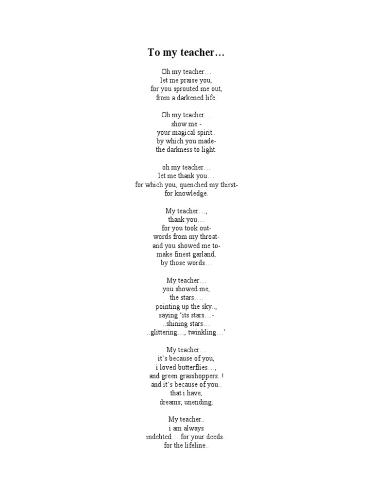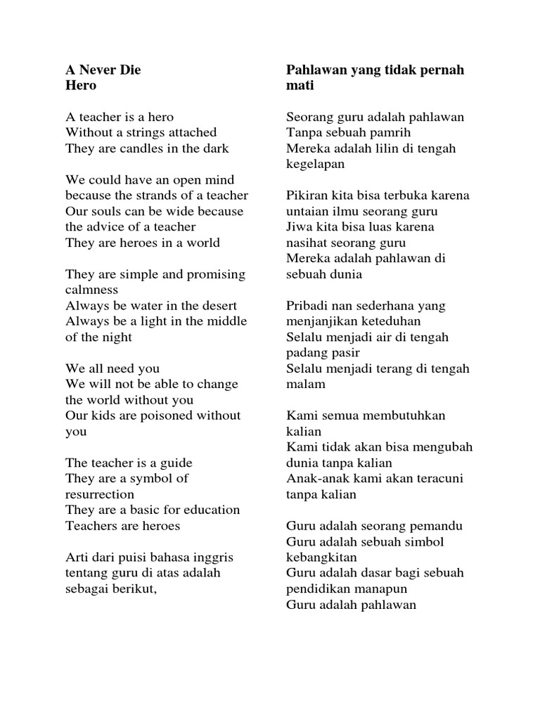 Salah satu akibatnya beberapa budaya kita telah di klaim oleh negara tetangga dan baru kita merasa marah akan tindakan negara tersebut. My heart fills with relaxation, all my happiness increase. Kali ini saya akan membahas tentang narrative poem atau puisi narasi. Thou are my guide, in blindness Thou are my cool dew, in dryness. Kumpulan puisi dalam bahasa inggris disertai artinya terbaik dan terlengkap 2016. Cek puisi bahasa inggris ini. Guru tidak bisa dilepaskan dari dunia pendidikan. Walaupun keseruan gambar itu nampak biasa, namun foto tersebut dapat mengubah mood kita, dari yang awalnya murung bisa menjadi senang waktu melihatnya.