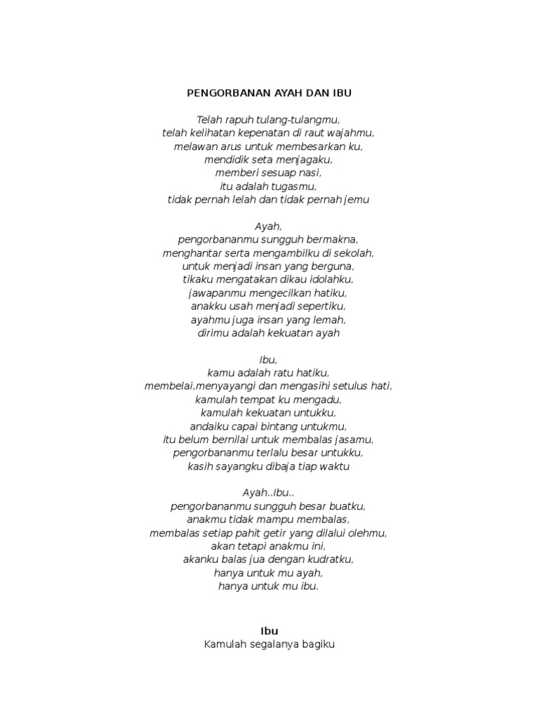 Yang pernah datang dan mengubah. Sajak adalah puisi melayu moden yang berbentuk karangan berangkap, berbentuk bebas dan tidak terikat pada jumlah baris, perkataan sebaris, suku kata sebaris, rangkap, rima dan sebagainya. Aziz guru adalah ibu pengasuh budiman guru adalah ratu lebah lalu memujuk membelai kelopak cinta kasih sayang lilinnya berbunga sinar cahaya madunya berbunga penawar jiwa. Puisi ibu sedih menyentuh hati: Ema… ti leuleutik abdi ngan ukur nyieun kasedih. Bunga sirih untuk guru j.m. Bangkit sanjaya · song · 1988. Dan pada kesempatan kali inilah al akan membagikan sajak tentang ayah, jadi sebelumnya ada postingan puisi tentang ibu sekarang ada postingan puisi tentang ayah (jadi lengkap, kan). Dia cantik, periang, selalu senyum, menawan, memukau, penuh kasih, dan paling dicintai dalam keluarga.