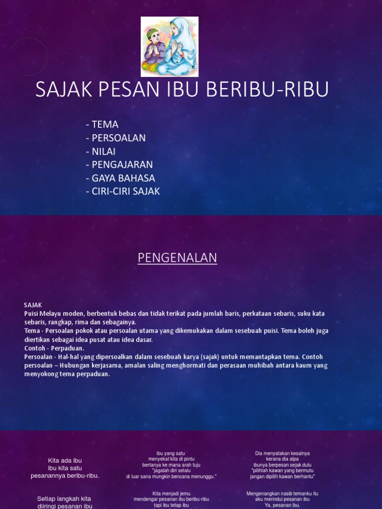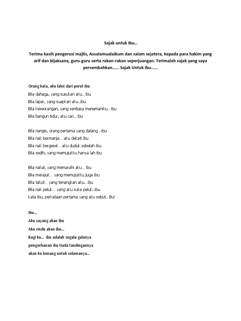 1) apakah tema untuk sajak ini? Sajak adalah salah satu bentuk karya sastra yang tidak terikat dengan aturan. Komsas bahasa melayu tingkatan 3. Listen to sajak untuk ibu on spotify. Lihat simpang jalan samping kota tindak tanduk ibu tua renta tak lelah pontang panting tak berhenti mondar mandir gunakan kesempatan sebelum kesempitan Jika dalam 66 daftar berikut tidak memuaskan kalian, silahkan telusuri kumpulan contoh puisi horor yang telah kami susun. Guru adalah lampu penyuluh pedoman. Guru adalah penyu pengasih lalu menabur bunga telur baktinya segar mewangi sepanjang pantal zaman. Ketelair indonesia_ kamu harus tahu, nak. Bangkit sanjaya · song · 1988.