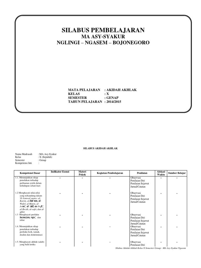 No kompetensi dasar pembelajaran materi pembelajaran kegiatan indikator penilaian teknik alokasi waktu. Download silabus akidah akhlak mts kelas 8 (delapan/viii) semester1 dan 2 kurikulum 2013. Hai sahabat ilmuguru, dalam kesempatan kali ini admin ingin share perangkat pembelajaran berupa silabus 6 kolom mapel akidah akhlak kelas iii tingkat sd/mi semester 1 dan 2 kurikulum 2013 tahun 2021/2022. April 17, 2021 ini merupakan siabus mapel akidah akhlak tingkat madrasah ibtidaiyah yang disusun berdasarkan kma 183 tahun 2019 tentang kurikulum pai dan bahasa arab oleh direktur jendral kementrian agama. Silabus adalah rencana pembelajaran pada suatu dan/atau kelompok mata. Yang mungkin bisa anda gunakan dalam menyusun perangkat pembelajaran. Silabus akidah akhlak kelas 12 k13 ma (format dokumen) rpp sma december 26, 2021 16:46. Download rpp, silabus, prota, prosem kkm k13 revisi 2019 aqidah akhlak kelas xii jenjang ma post a comment rpp dijabarkan dari silabus untuk mengarahkan kegiatan belajar peserta didik dalam upaya mencapai kd. Penyusunan model silabus dan rpp ini berpedoman pada standar kompetensi lulusan (skl) dan standar isi (si) pendidikan agama islam dan bahasa arab di madrasah sebagaimana tertuang. Silabus akidah akhlaq, merupakan perencanaan pembelajaran yang dibuat mencakup satu jenjang pelajaran yang berisi.