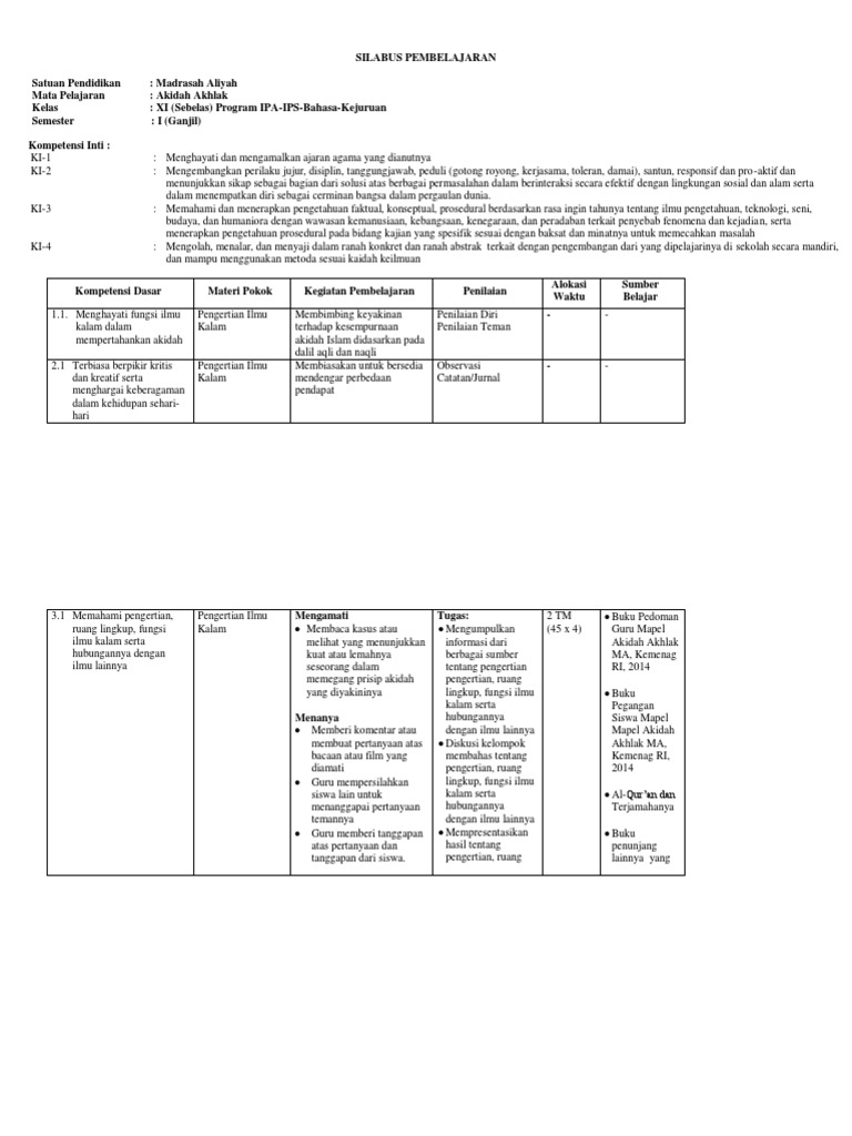 Silabus rpp aqidah akhlaq kelas xi ma mak sma smk k13. Dalam artikel lainnya anda bisa mendapatkan rpp, program tahunan, program semester, dan perangkat akidah akhlak lainnya secara lengkap untuk kelas 7/vii, 8/viii, 9/ix. April 17, 2021 ini merupakan siabus mapel akidah akhlak tingkat madrasah ibtidaiyah yang disusun berdasarkan kma 183 tahun 2019 tentang kurikulum pai dan bahasa arab oleh direktur jendral kementrian agama. Silabus revisi 2020 aqidah akhlak kelas 7. Dalam silabus akidah akhlak mi kurikulum 2013 semester 1 dan 2 ini merupakan perangkat terbaru. Silabus aqidah akhlak mi kurikulum 2013. Silabus ini hanya sebagian dari perangkat pembelajaran aqidah akhlak yang harus dimiliki oleh guru bersangkutan sebagai perencanaan mengajar. Penyusunan model silabus dan rpp ini berpedoman pada standar kompetensi lulusan (skl) dan standar isi (si) pendidikan agama islam dan bahasa arab di madrasah sebagaimana tertuang. Termasuk perangkat pembelajaran yang wajib dimiliki oleh guru madrasah sebagai acuan dalam kegiatan belajar mengajar.